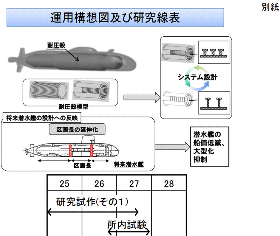 将来潜水艦のモデルとして艦艇装備研究所のパンフレットに載っていた、潜水艦耐圧殻構成要素に関する研究のイラストを元にDdogが修正して作画した2016年のイラストである。もしかしたらと内部イラストを隠し表面を覆っただけですが、将来潜水艦のコンセプトはこうなんだという参考程度で作画たものだが・・・