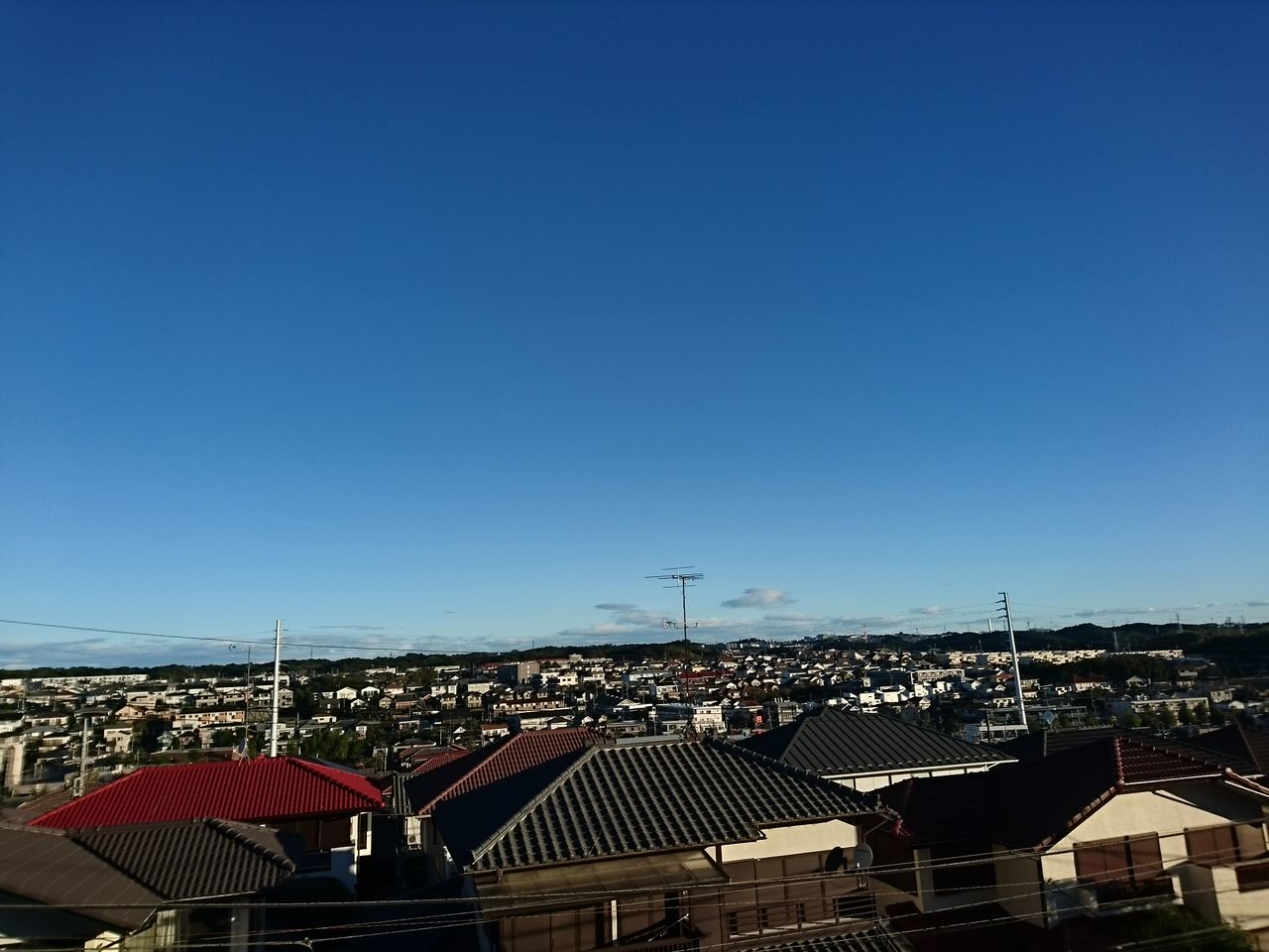 台風一過10月13日朝6時過ぎ青葉区の我が家2階から見た北の空。遠くに19号の雲の尻尾が見えます。