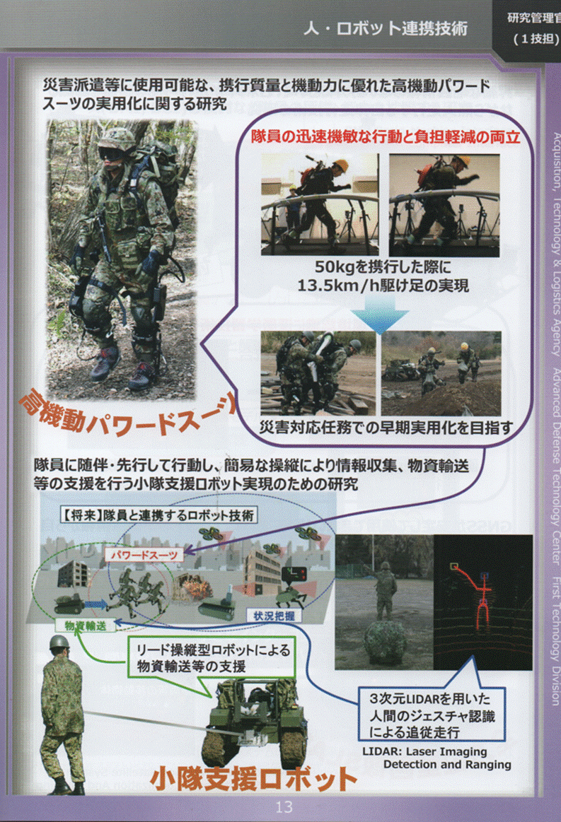 1.背景・目的先進技術推進センターでは、平成27年度から「高機動パワードスーツ」の研究を行っている。この研究では、民生品のパワードスーツに比べ、重量負担を軽減しつつ、野外の不整地においても、駆け足のような迅速機敏な行動ができるパワードスーツを目指している。現在、パワードスーツ技術は民生分野においても研究開発が進んでおり、介護従事者用やリハビリ支援用、物流業界向け等のパワードスーツが既に製品化されている。しかしこれら民生品のパワードスーツは、歩行動作の支持や平地での重量物運搬を主な目的としており、アシストされる動作が歩行に限られている場合や室内環境での使用を前提としている場合が多い。一方、自衛隊に必要とされるパワードスーツは、災害派遣等の任務において隊員の装備品や救助する負傷者の重量を支持すると同時に、歩行だけでなく駆け足のような素早い動作を可能とし、砂地や山岳地、泥濘地等の不整地にも対応する必要がある。このため、民生品のパワードスーツに比べ高い機動性を実現し、かつ野外の不整地においても安全に運用できるようなバランス制御の安定性を確保することが求められる。本研究では、重量を支持しながらも素早い動作を行うために、外骨格構造により重量負担を受け持ちつつ、人間の動作に追従できる機構を備える、下肢に装着するパワードスーツの試作を行った。2.研究内容研究の手法としては、プロトタイプの設計・製造と試験評価を短期間で繰り返し、試験データ、装着者(陸自隊員)の意見等をパワードスーツの設計に随時反映するスパイラル的な研究試作を行い、試作品を平成29年度末に完成させた。平成30年度からは、試作品を隊員が装着して、高機動パワードスーツの性能評価を実施している。実験室環境では、三次元動作解析装置、床反力計付トレッドミル等の器材を用いて動作解析を実施し、高機動パワードスーツの基本性能等について評価を実施した。その後、陸自演習場において、特に災害派遣任務で運用される際の環境を模擬した試験を行い(図1)、改善ポイントの抽出を行った。現在は、得られた試験データをもとに、改良型のパワードスーツを製造しているところである。なお、パワードスーツのユーザビリティやデザインについても、陸自隊員との意見交換会等を実施し(図2)、実際の運用者の率直な意見を設計に反映できるよう取り組んでいる。3.今後の予定今後は、これまでの試作・試験で得られた成果を反映して製造している改良型のパワードスーツを用いて、試験評価と改良ポイントの抽出を繰り返し行い、災害派遣任務において隊員の負担軽減等に寄与するパワードスーツの早期実用化を目指し取り組んでいく。図1 災害派遣任務を模擬した野外試験の様子図2 陸自隊員との意見交換会の様子*先進技術推進センター研究管理官(第1技術領域担当)付 協調ロボットシステム技術推進室