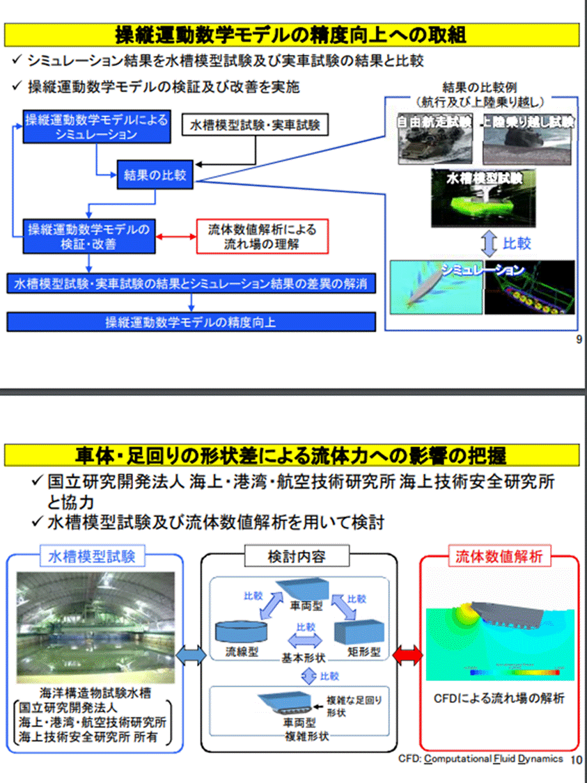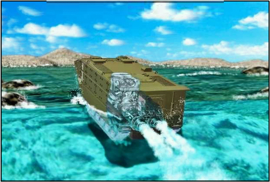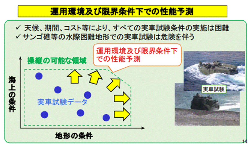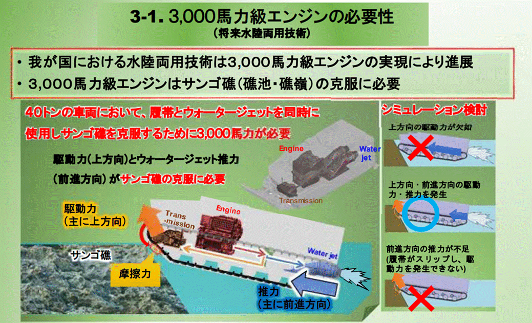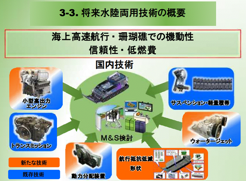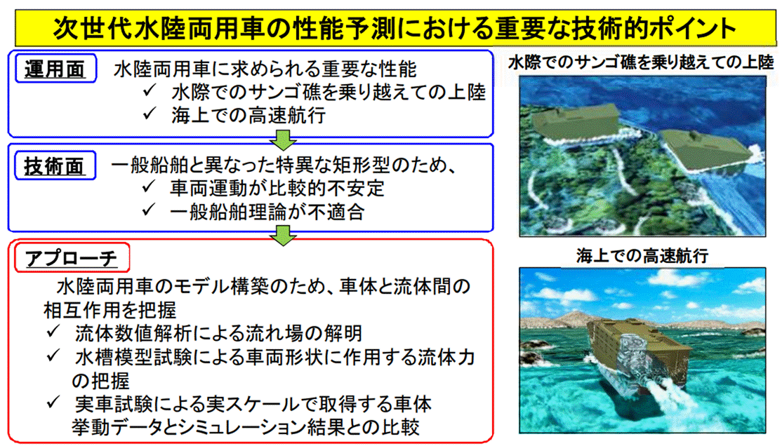 我が国の島嶼侵攻事態時に、水陸両用車を用いて洋上の海自輸送艦から島嶼部への部隊投入による島嶼防衛をより効果的・効率的に行うためには、水際機動性や海上航行速度の向上を実現することが有効であり、これらの実現のために、本事業では、平成29~令和4年度にかけて将来の水陸両用技術として、水際機動能力向上技術(水際での機動困難な条件を克服して機動性を高める技術)、海上高速航行技術(海上で車両が高速航行できる技術)及び乗員安全性を備えた将来の水陸両用車に関する全体システム設計の最適化及び高出力エンジンの小型化、構成品の能力向上に関する研究を行うものである。