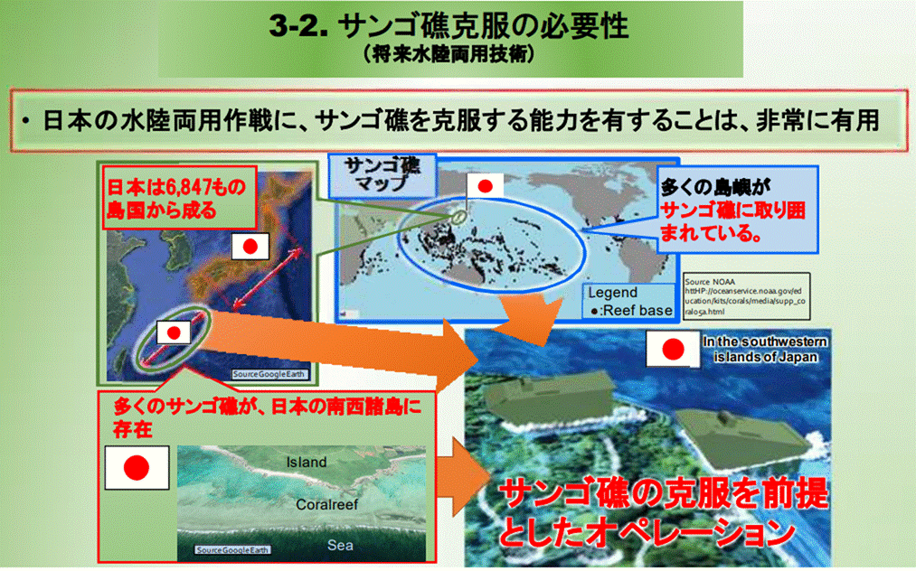 珊瑚礁は天然の上陸阻止トラップのようなものだ。第二次世界大戦から現代に到るまで、上陸側はなだらかな砂浜にしか上陸できなかったがゆえに、上陸地点は予想でき、防御側が容易に防御陣地を構えることができた。それがもし、珊瑚礁を突破できるとなると、防御側は、事前に防御陣地を構えることができなくなってしまうこともある。特に珊瑚礁が発達した沖縄の島々ではほぼ島の全周が上陸対象となってしまうのである。