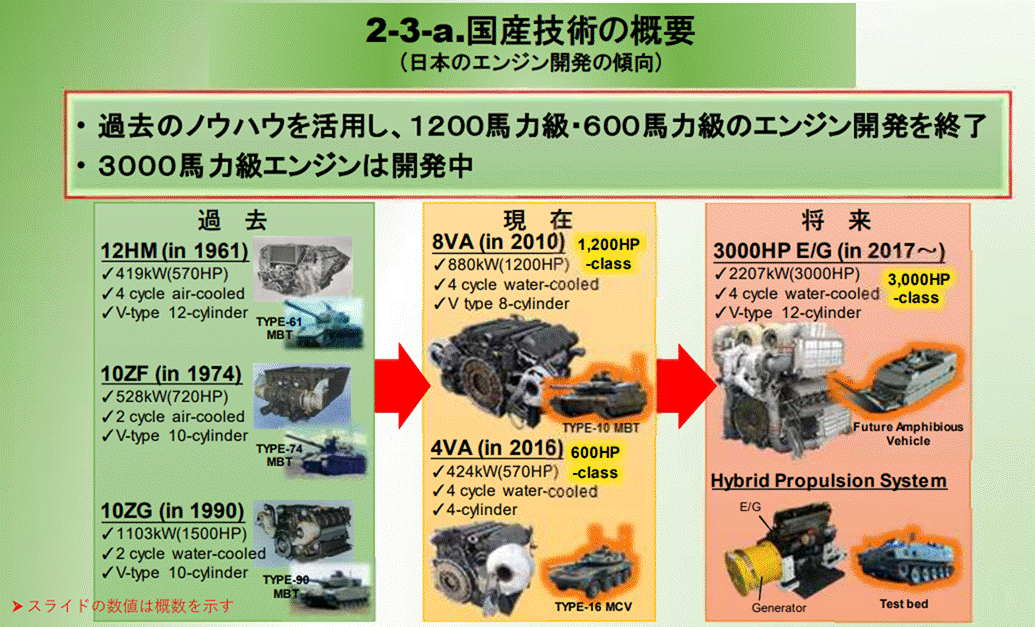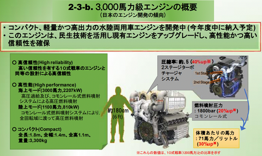 エンジンはディーゼル機関車同じ3,000馬力が出る小型ディーゼルエンジン「12MB」である。開発は既にほぼ完了しており、3000馬力が同程度の既存エンジンに比べて、7分の1程度になっているという。10式戦車の高性能ディーゼルエンジンの更に上をいくターボチャージャー圧縮率で40%up 燃料噴射圧力20%up 体積あたりの馬力71馬力/リットルは30%upだ!ちなみに3000馬力のディーゼルエンジンとは、ディーゼル機関車のディーゼルエンジンが3000馬力相当であり、その大きさからしていかにコンパクト化しているかわかりやすい。