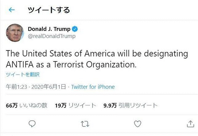 こういった状況を受け、トランプ氏は5月31日にフロリダ州で行った講演で、「暴力と破壊行為は、無実の人々を恐怖に陥れ、雇用を破壊し、事業に損害を与え、建物を焼き払うアンティファやその他の極左過激派グループが主導している」などと非難。6月1日未明には、州兵がミネアポリスで「良い仕事をした」として、「特にアンティファ率いる無政府主義者らは、すぐにシャットダウンされた」とツイートした。その20分後には「米国はアンティファをテロ組織に指定する」