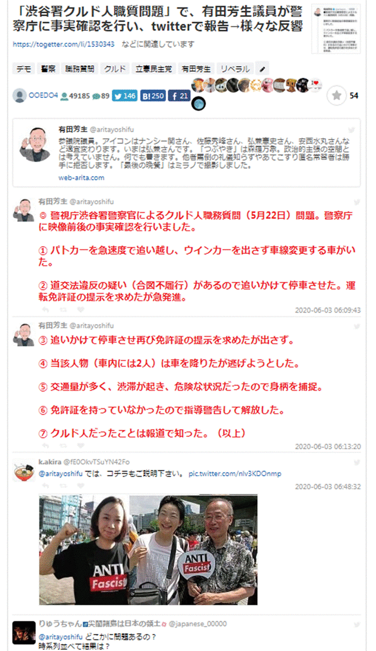オウム真理教騒動以降まったく社会に貢献していなかったあの有田芳生氏が二十数年ぶりに仕事をした。渋谷警察のクルド人職質騒動を何も考えずに、ついうっかり調べ、すぐにツイッターでツイートしてしまったのだ。左翼側にとっては痛い失点である。
