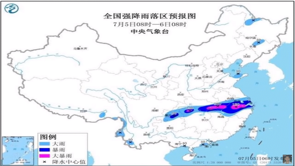 7月4日現在九州を襲っている同じ梅雨前線は長江流域にかかっている。