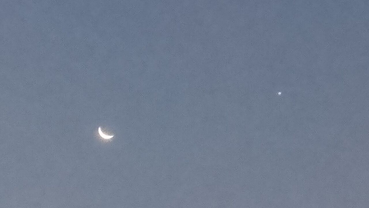 今朝起きると、東の空はしらみはじめていました。見上げると上空にはまだお月様と明けの明星(金星)が輝いていました。
