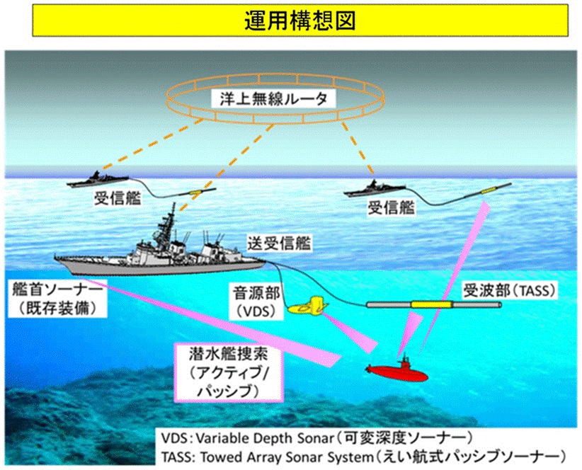 ※マルチスタティック処理能力:別々のソーナーで発信と受信を行うことで、探知類別性能を向上させる処理を行う能力は、ソーナーシステムのマルチスタティック信号処理技術、戦闘指揮システムの自律向上処理技術及び水測予察技術、データリンクによる多機能情報共有技術の各技術をくみ合わせ、総合的にマルチスタティック戦術に関する技術を確立する。