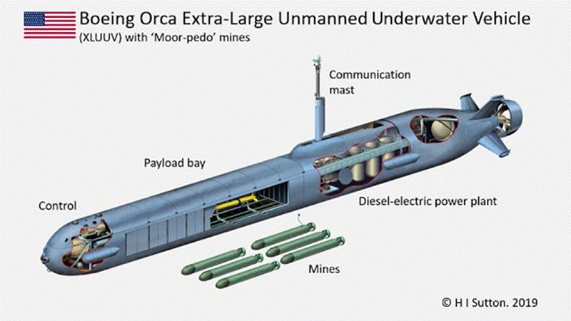 https://svppbellum.blogspot.com/2020/02/orca-xluuuv-la-balena-della-boeing-e-un.html米海軍はVLUUVオルカの用途について明らかにしていないが、外部ペイロードとして機雷を搭載し、潜航して目的地に侵入、機雷を薮設するといった用途が考えられているとも報じられている。あるいは着底して待機し、潜水艦の接近を探知すると音響信号や無線で情報を送るといった用途もありうるかもしれない。
