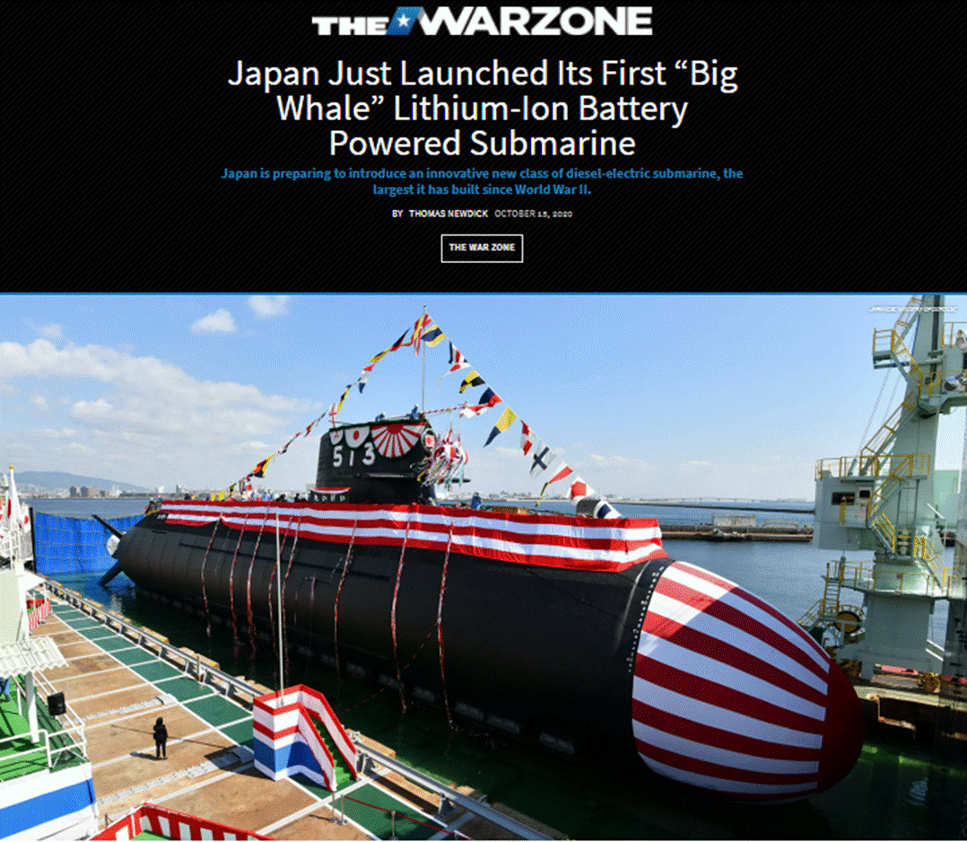 日本は潜水艦の静粛性能を高めるためAIP機関よりも低振動な「リチウムイオン式電池」採用に踏み切ったと説明、リチウムイオン式電池は火災や発熱問題など安全性に対するリスクが付き纏うが、AIP機関採用の潜水艦よりも優れた水中加速性能を日本の潜水艦にもたらすだろう言っており、日本は静粛性能と水中加速性能で中国に対抗するつもりだと評価している。