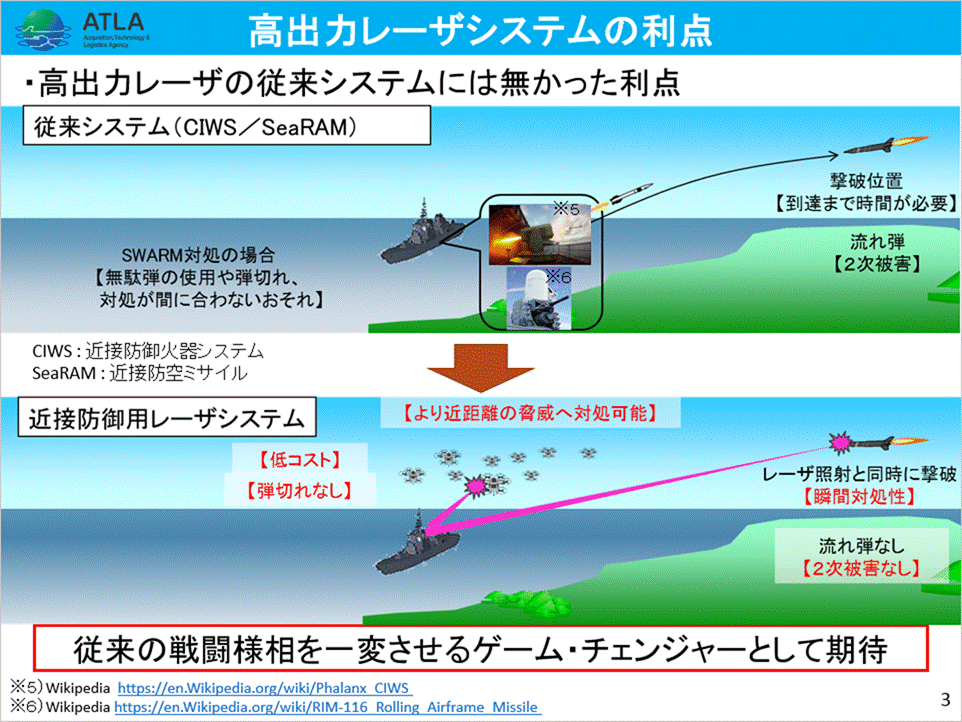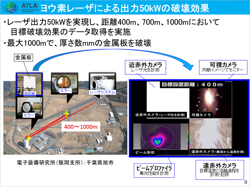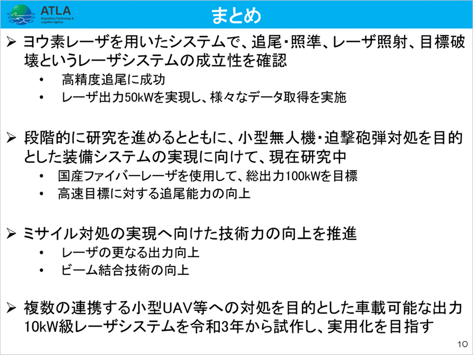 しかし化学レーザーでは発展性に乏しく運用面から鑑みても希土類元素を添加した光ファイバーをレーザー媒質として利用するファイバーレーザの方が優位であるため、ATLAで現在試作中の100kw級はファイバーレーザである。その具体的成果が高出力レーザー兵器(UAV対処用車載レーザ装置)と思われます。