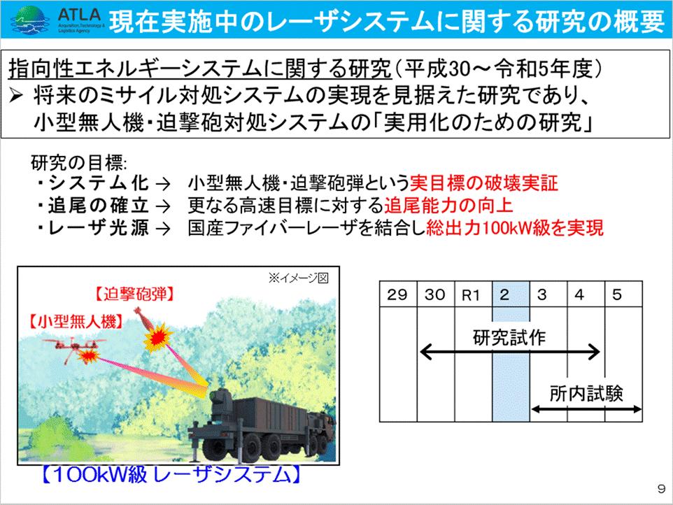 現在ATLAでは100Kw級が研究開発されており、いよいよ本年度(令和3年度)より照射機が試作され実用化に向けテストが行われる。ATLAにて50kw級の照射テストが行われてきたが、50kw級で破壊出来るのは無人小型機ドローン程度である。