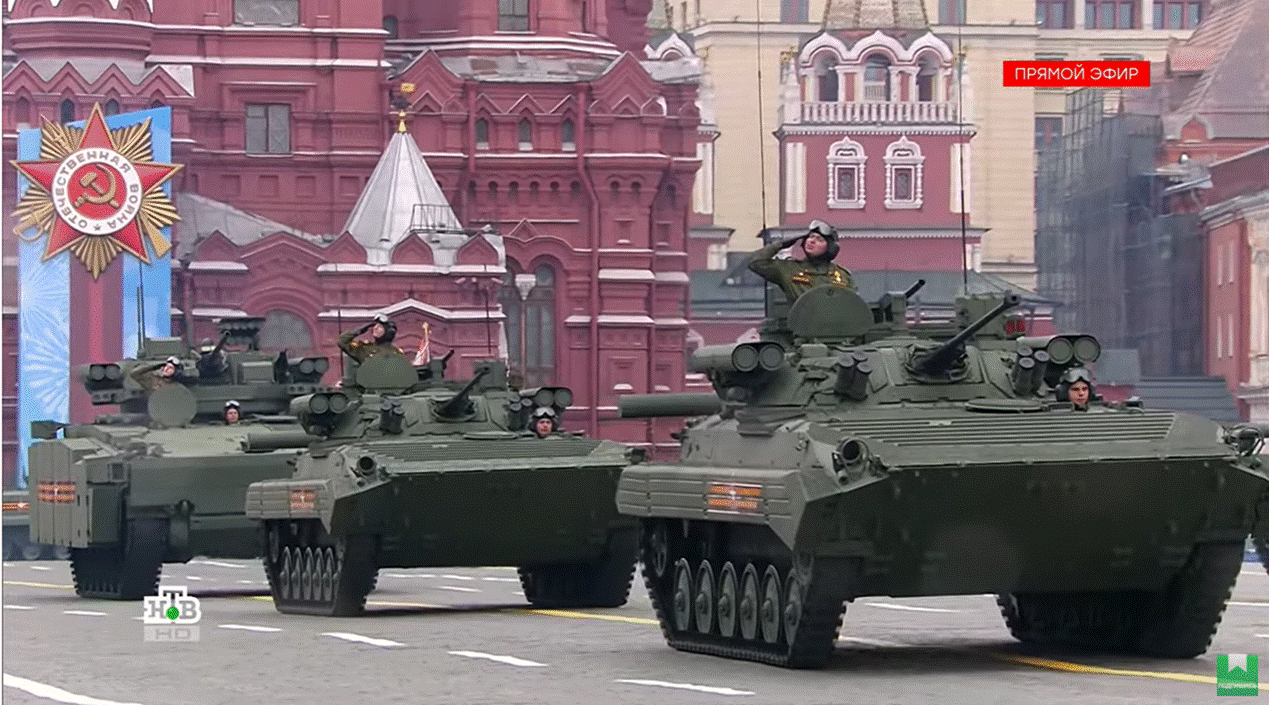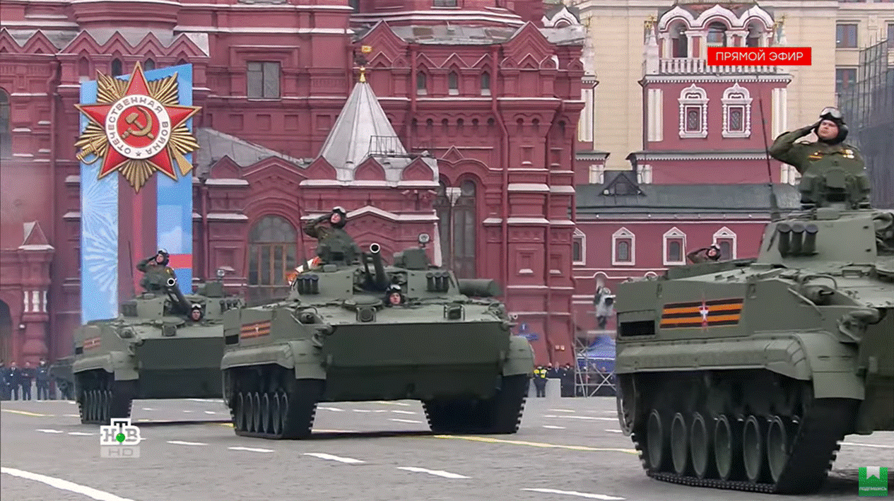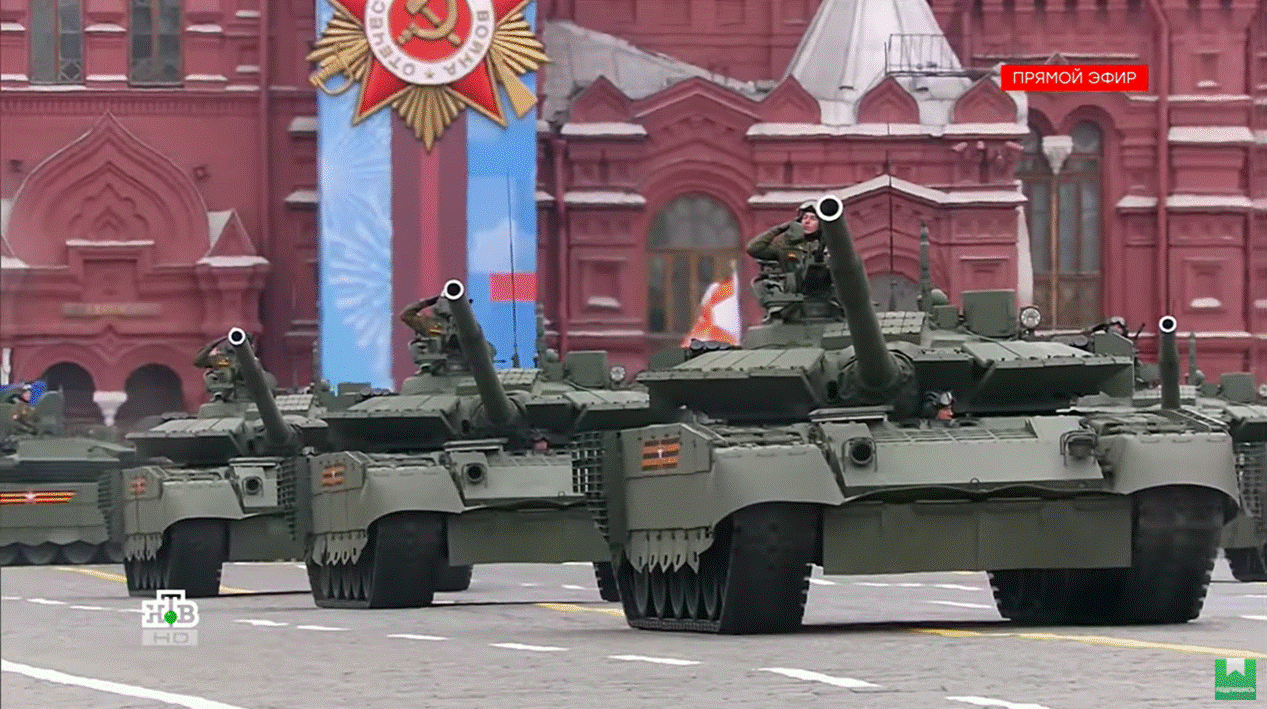 今回は↓昨年のドイツ戦勝パレードに比べ最新鋭T-14アルマータ戦車はモスクワのパレードに出た輌数が少ない。