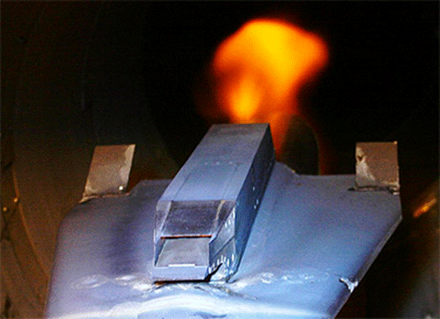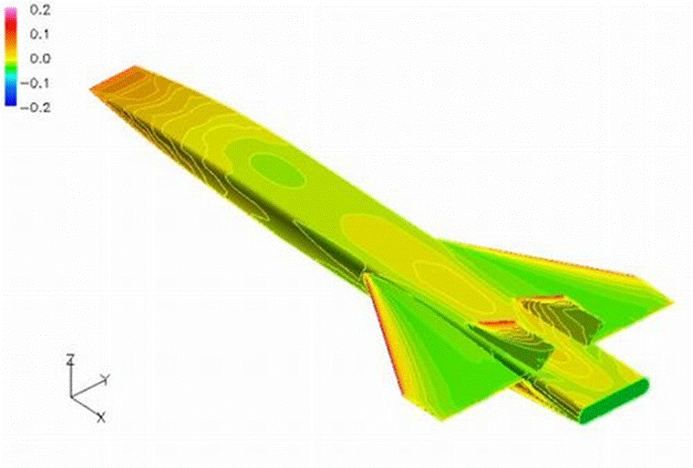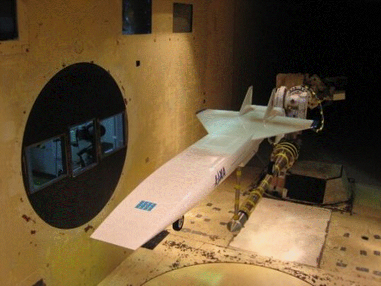 マッハ5巡航飛行時の高温環境からの熱の侵入を抑える遮熱壁と、客室や機体構造を一定温度に保つための熱管理設計について検討を進めています。極超音速風洞実験で機体表面の温度分布を求めるとともに、遮熱壁の要素実験を進めています。最も高温となる胴体と主翼の先端部には高温に耐えて軽量の炭化ケイ素系の複合材料を適用することを検討しています。極超音速風洞実験で得られた温度分布極超音速技術実験機の検討