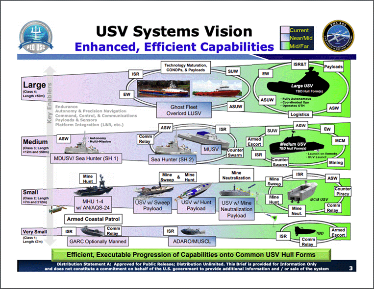 ※ロケット発射指揮者(LCDR:Launch Conductor)LCDR Jon Noda、USN、SURFDEVRON、N5 は、米海軍の無人システムに関する最も多くの情報を提供しました。野田氏は、米海軍の USV プログラムはまだかなり新しいものであると述べ、「私たちはかなり早い段階でこのゲームに参加しています」と述べています。野田氏は、米海軍は無人水上艦艇(USV)をより早く艦隊に導入してその価値と利益を最大化するために「取得ギャップ」を埋めたいと考えていると述べ、例として、野田氏は米海軍の無人機船、 Sea Hunter は、現在 USS Anchorage と共に運用されています。聴衆は、米海軍が配備されたときにUSVの物理的なセキュリティをどのように維持するつもりかについて質問しました. LCDR 野田氏は、ハードウェア側については詳しく説明しませんでしたが、ソフトウェアのセキュリティを確保することが重要であると述べました。The U.S. Navy’s vision roadmap for adding Unmanned Surface Vessels (USVs) to its Fleet. USV sizes range from the very small to the large and payloads vary dependent on the USV’s size, mission, design, function, layout, capabilities, and endurance. U.S. Navy PEO USC graphic無人水上艦 (USV) を艦隊に追加するための米国海軍のビジョン ロードマップ。USV のサイズは非常に小さいものから大きいものまであり、ペイロードは USV のサイズ、ミッション、設計、機能、レイアウト、機能、耐久性によって異なります。米海軍PEO USCグラフィック別の聴衆の質問は、MUSV と LUSV の意図された機能について尋ねました。LCDR野田氏は、2022年度の計画では、MUSVにセンサーと電子機器のペイロードがあり、MUSVが最初に納入されると回答した. LUSV は※補助マガジン [複数の VLS セルと考えてください] として機能することを意図しており、LUSV は予定された配送のさらに先にあります。