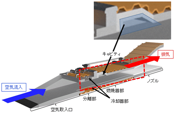 1.緒論スクラムジェットエンジンとは、空気取入口で生じた斜め衝撃波により圧縮した超音速の気流に燃料を噴射し、燃焼させて推力を得るエンジンである(図1参照)。スクラムジェットエンジンは、そのシンプルな構造と極超音速飛しょうにおける最も高い比推力から、極超音速誘導弾用推進装置に適しており、各国において盛んに研究されている。図1 スクラムジェットエンジンの概略図幅広いマッハ数域で飛しょう可能な極超音速誘導弾の実現には、飛しょう条件によりラムジェットエンジン(RJ)及びスクラムジェットエンジン(SJ)として作動可能なデュアルモード・スクラムジェットエンジン(DMSJ)が必要である。また、機体の小型化のため、単位体積あたりのエネルギー密度が高いジェット燃料の採用も必須である。しかしながら、スクラムジェットエンジンの滞留時間は極めて短く、ジェット燃料を採用しつつ安定に作動する DMSJを実現する技術的ハードルは高い。同形式のエンジンの宇宙輸送機への適用を目指す宇宙航空研究開発機構(JAXA)との研究協力の下、航空装備研究所(ASRC)は平成29年度と30年度にジェット燃料を採用した DMSJ 燃焼器の燃焼試験を実施し、基本的な性能を確認した。本発表では、これまでの成果とともに ASRCの DMSJ 研究の展望を紹介する。2.技術課題克服のアプローチDMSJ では、滞留時間が短い燃焼器でジェット燃料を高効率かつ安定に燃焼させることが重要な技術課題である。この課題を克服するため、本研究では超臨界圧力下で加熱されたジェット燃料を燃焼器内に噴射する方式を採用した。実機では、ジェット燃料でエンジンを冷却する工夫(再生冷却)により、ジェット燃料の加熱も可能である。噴射されたジェット燃料は速やかに気化し、気流と混合し、燃焼する。混合を促進するため、噴射器近傍に混合促進器を設けた。また、循環流による保炎効果を得るため、流路途中にキャビティを設けた。技術課題克服のアプローチを図2に示す。図2 技術課題克服のアプローチ3.燃焼試験結果燃焼器の燃焼試験は、JAXA 角田宇宙センターの基礎燃焼風洞を用い、直結方式により行った。ジェット燃料には Jet A-1 を用いた。結果の一例として、燃焼器内の燃焼反応により発生した OHラジカル自発光の一例を図3に示す。Jet A-1 は気流中で良好に燃焼し、RJ モード・SJ モードともに燃焼器が安定作動することを実証した。取得した燃焼器壁面静圧分布を用いてエンジン内部流れの解析を行い、実機相当のエンジンでは所望の飛しょうに必要な推力が得られる見込みも得た。図3 燃焼器内の OH ラジカル自発光の一例4.今後の展望ASRC では、DMSJ を搭載した極超音速飛しょう体の早期の飛行実証を目指している。これまでの研究成果を活用し、ASRC は今年度からDMSJ の試作に着手したところであり、今後地上試験装置を用いて再生冷却も含めたエンジンシステムレベルでの実証を行う計画である。*航空装備研究所エンジン技術研究部 ロケットエンジン研究室