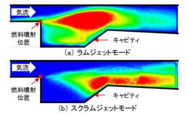 超音速~極超音速への加速時の燃焼状況 極超音速巡航時の燃焼状況(ラムモード) (スクラムモード)