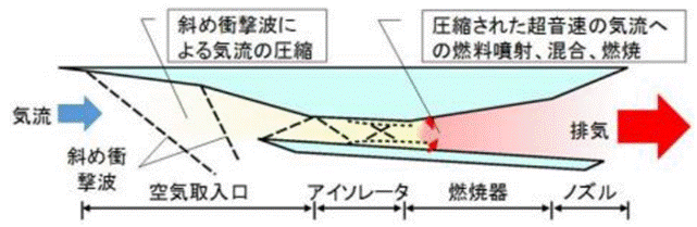 将来の誘導弾への適用を目指し、従来のエンジン技術では実現できなかった高高度極超音速(マッハ5以上)巡航を可能とする「スクラムジェットエンジンの研究」を実施しています。超音速飛翔体(イメージ図)本研究では、装備品としての実現に留意し、従来までの研究の主流であった水素燃料に比べ、機体規模の小型化、入手性・貯蔵・取扱の容易さに大幅に優れる炭化水素燃料(ジェット燃料)を採用するとともに、超音速から極超音速までの幅広い速度域での作動を実現する、ラムモードとスクラムモードの2つのモードによるデュアルモード・スクラムジェットエンジンの実現を目指しています。極超音速飛しょう体の飛しょう経路(例)炭化水素燃料を用いたスクラムジェットエンジンの成立性の検証のため、JAXAとの研究協力の下、燃焼試験を行い、ジェット燃料によるスクラム燃焼に成功するとともに、冷却系検討に資する基礎データを取得しました。これらの研究成果に基づき、実飛しょうを想定したスクラムジェットエンジンシステムの研究に取り組んでいます。注)スクラムジェット燃焼器は上図赤線部分を模擬燃焼試験結果の例